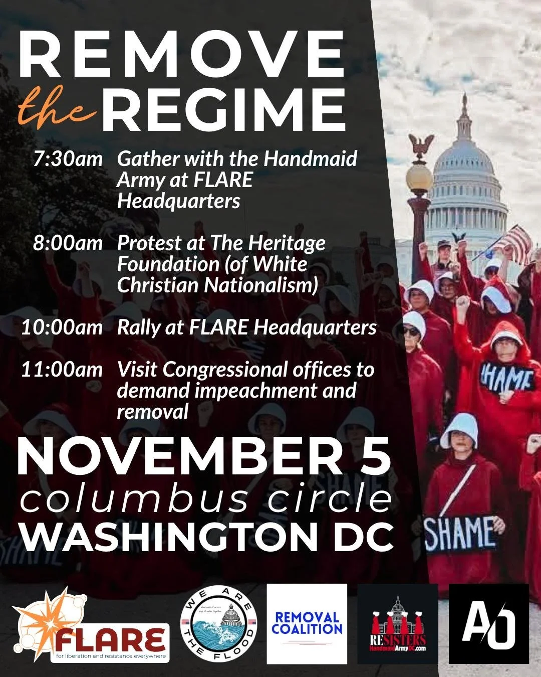 We joined The Handmaid Army, Flare, and the Removal Coalition in organizing a direct action in Congress where we visited all congressional offices and then joined the Refuse Fascism protest and march through Washington, DC calling for the removal of the regime. We also joined a protest at Immigration and Customs Enforcement (ICE) organized by Remember your Oath and a protest at the Heritage Foundation organized by Flare featuring The Handmaid Army.