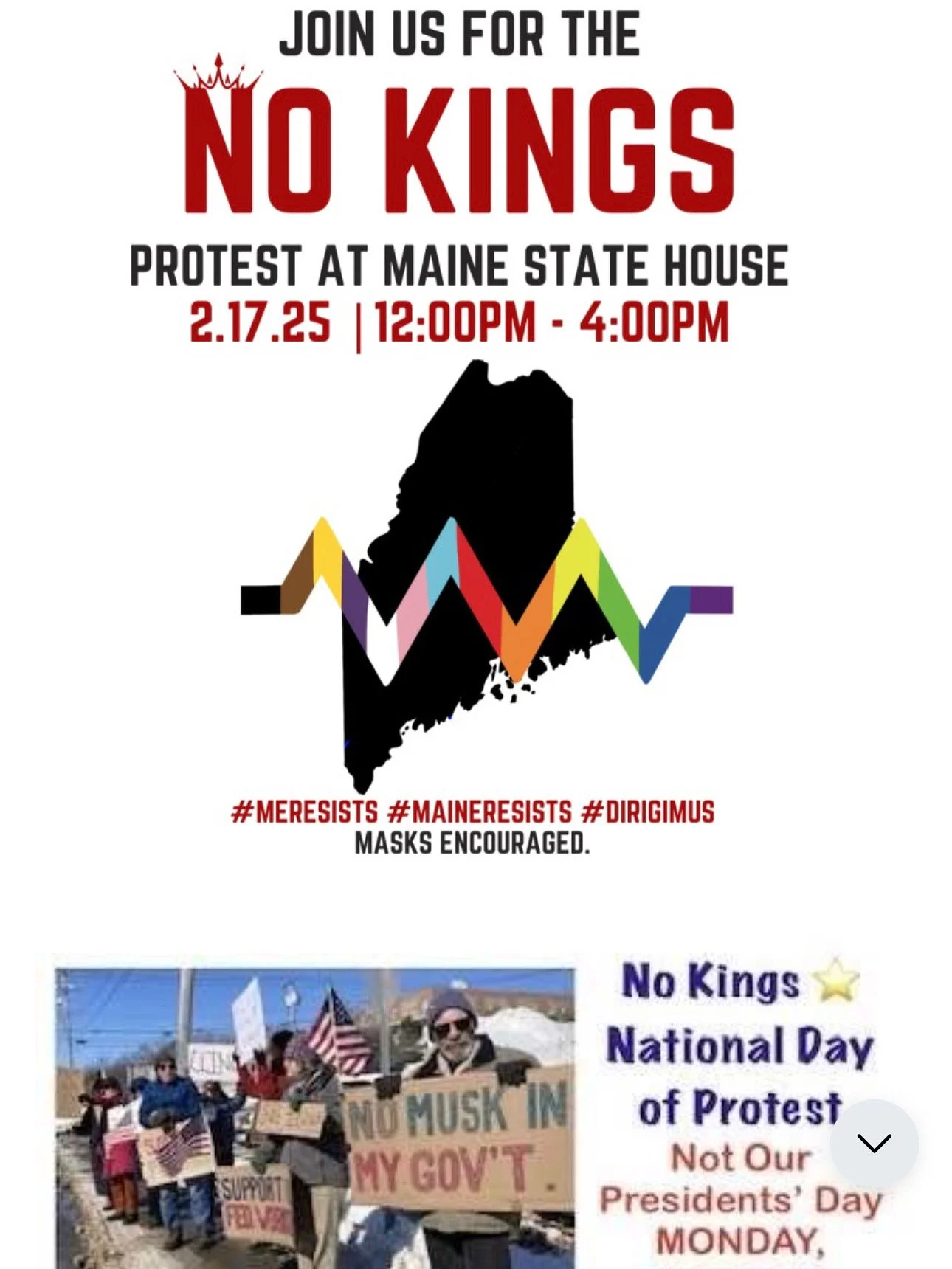 We called for the second National Day of Protest on February 17, 2025, which became the first “No Kings” protest (when 50501 joined our call, they didn’t want to use our tag—Not My President Day—so they used “No Kings.”). Our founder gave a powerful speech at the U.S. Capitol.