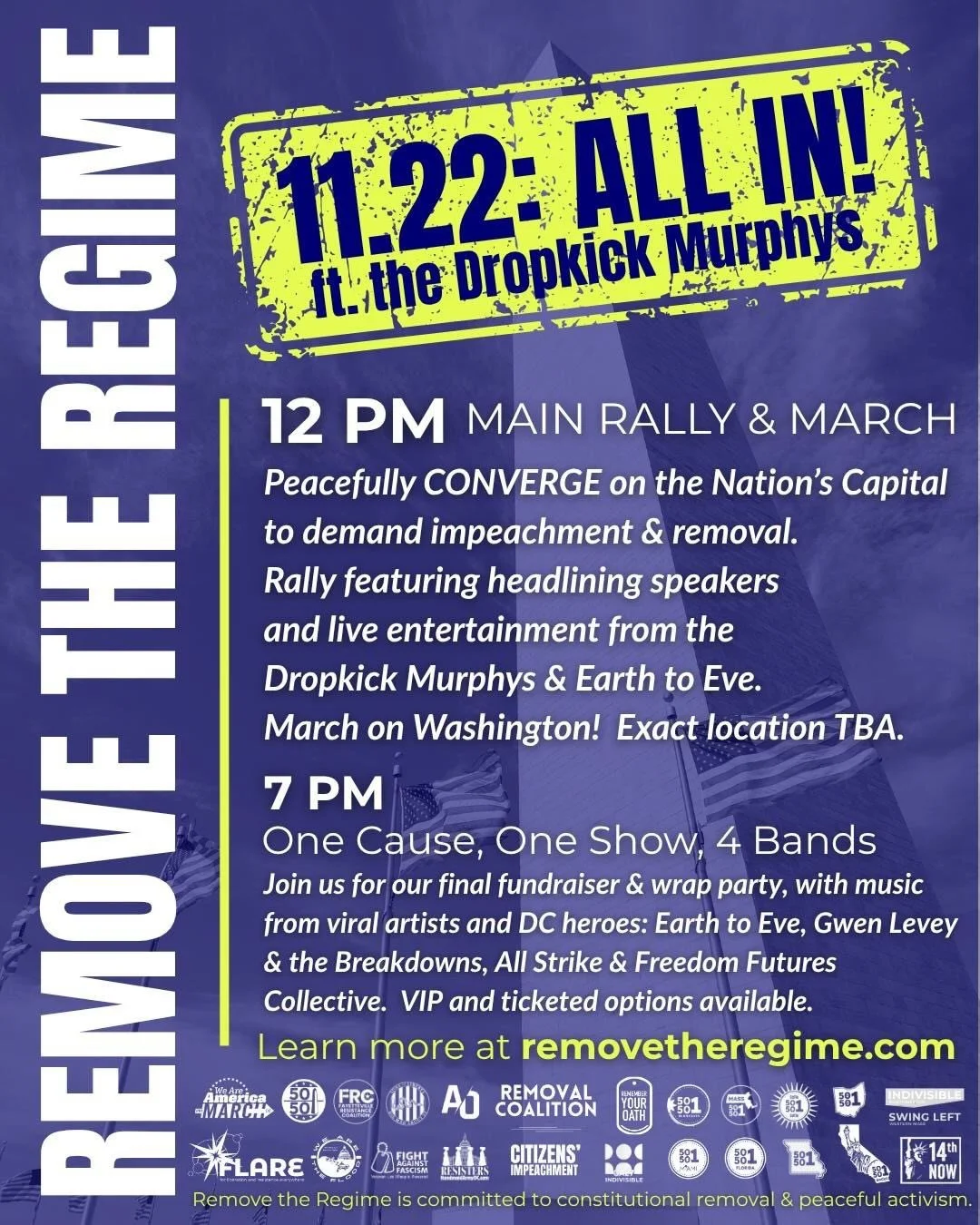 In partnership with the Removal Coalition, We Are The Flood, Flare, Remember Your Oath, and many others, we will be calling for the immediate impeachment, conviction, and removal of Donald Trump. The three-day program will feature multiple events culminating in a massive rally at our nation’s capital. The rally will feature a performance by The Dropkick Murphys and an all-star lineup of speakers.